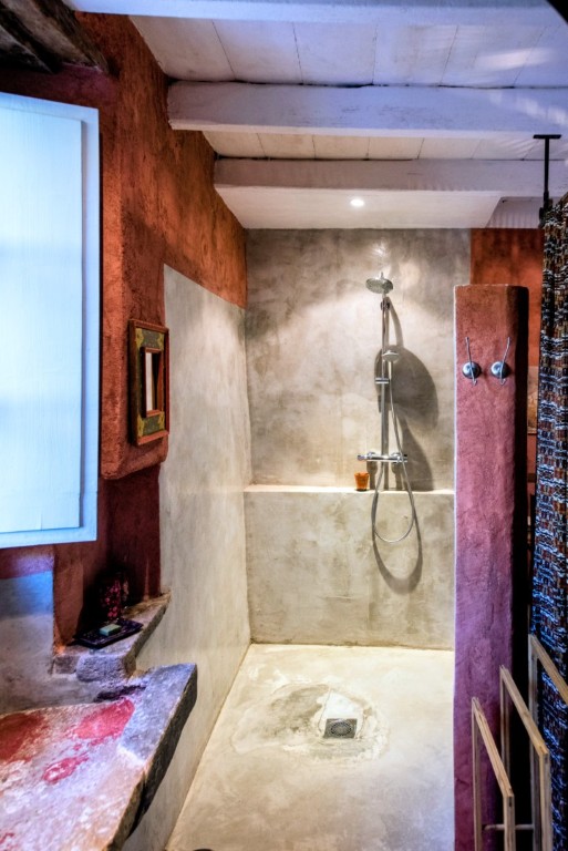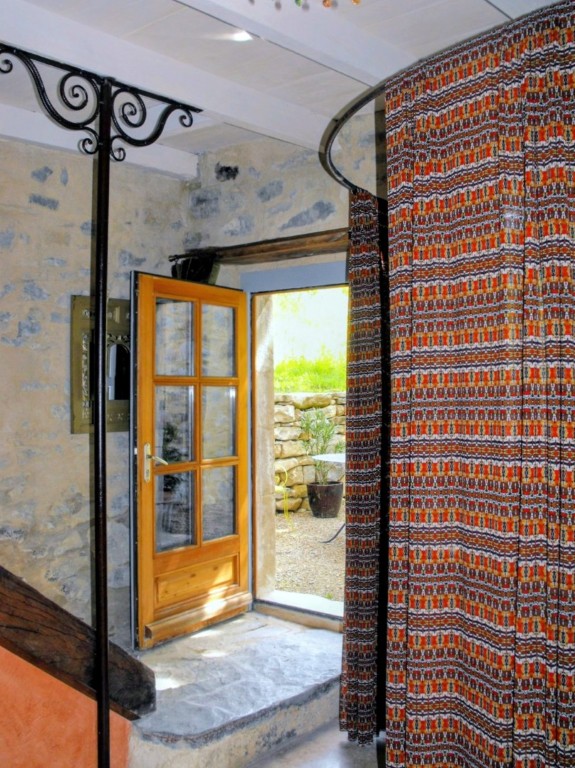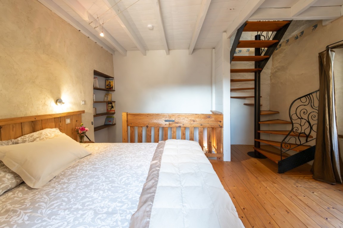 Espace intime et lumineux, aux murs enduits à la chaux. Petite suite indépendante organisée sur trois niveaux, ouverte sur un jardinet privatif ombragé par un tilleul centenaire. Accès direct vers l’extérieur, idéal pour un réveil en douceur ou un café au calme.